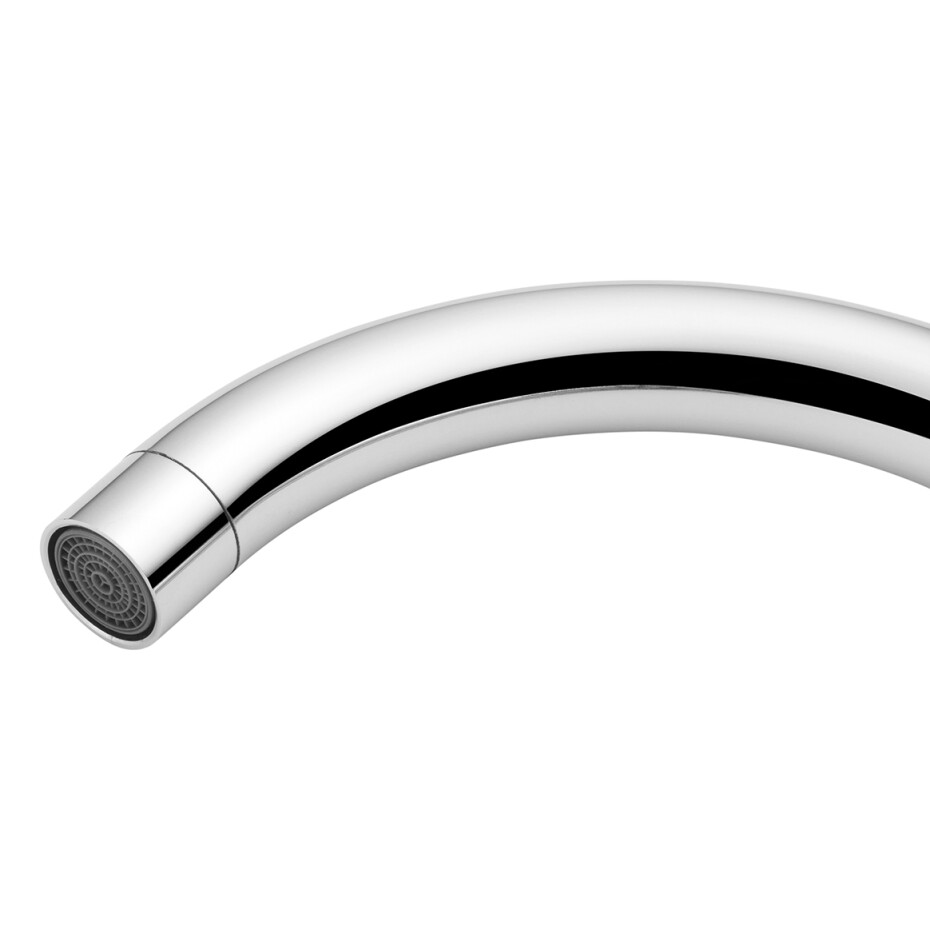U-подібний поворотний вилив висотою 250 мм та довжиною 175 мм забезпечує зручний доступ до мийки та дозволяє легко наповнювати велику посуду або переміщувати струмінь води між чашами. Завдяки врізному способу монтажу та кріпленню на гайку встановлення відбувається швидко та надійно.