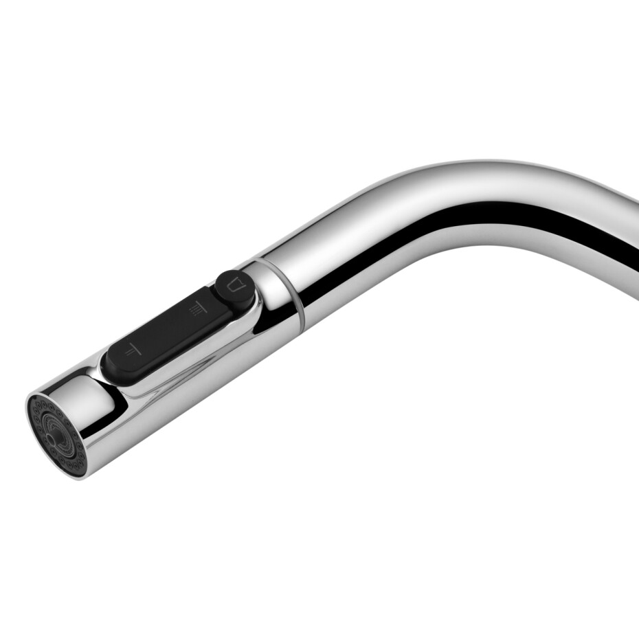 Модель оснащена висувним шлангом, який робить повсякденні завдання біля мийки значно зручнішими — миття посуду, наповнення великих місткостей і очищення раковини виконуються швидко і без зайвих зусиль. Практична кнопка перемикання режимів розташована прямо на висувній лійці, забезпечуючи інтуїтивне і комфортне управління потоком води одним натисканням.