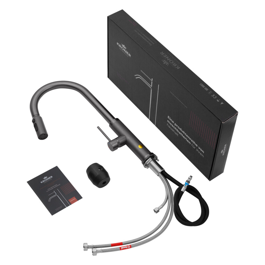 Змішувач для кухні Kroner KRP Edelstahl Berg - GRP030-T (графіт) — сучасний і технологічний кухонний змішувач у стильному графітовому кольорі з матовим покриттям, який ефектно підкреслює інтер'єр і виглядає особливо актуально в кухнях у стилі лофт, модерн або мінімалізм.