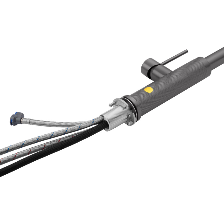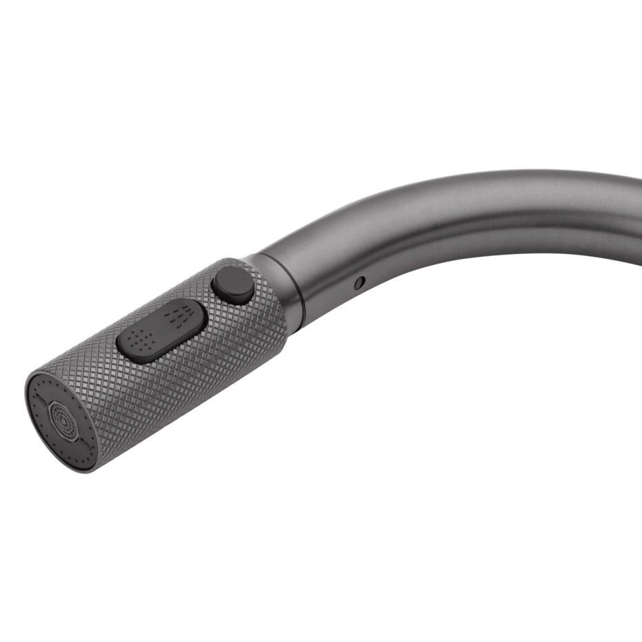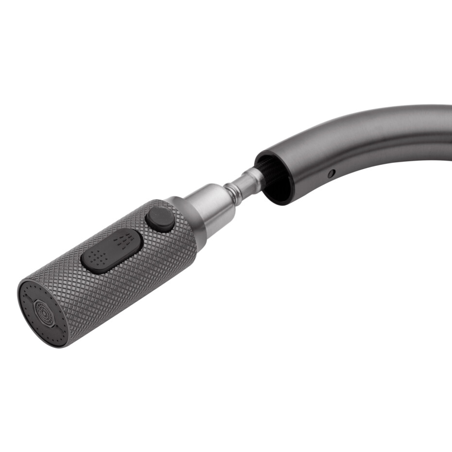 Модель оснащена висувним шлангом, що значно спрощує миття посуду, наповнення місткостей і догляд за мийкою. Особливістю змішувача є зручне управління подачею питної води — кнопка перемикання розташована прямо на самій висувній лійці, що робить використання максимально інтуїтивним і комфортним без зайвих рухів.