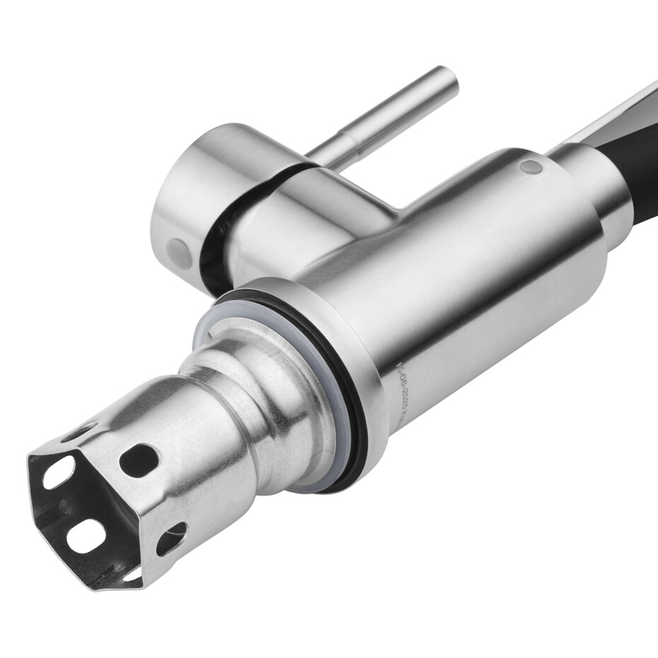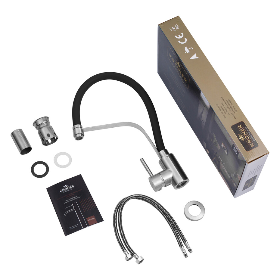 Kroner KRP Edelstahl Klassisch - ESG03593BLK — сучасний кухонний змішувач з елегантним чорним гусаком, який ідеально поєднує практичність і стиль. Корпус виготовлений із високоякісної нержавіючої сталі, що гарантує довговічність і стійкість до корозії. Гнучкий вилив забезпечує максимальну зручність у користуванні, дозволяючи легко направляти потік води.