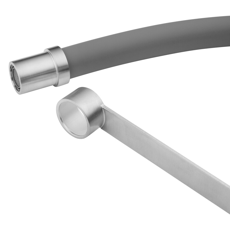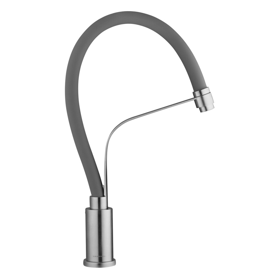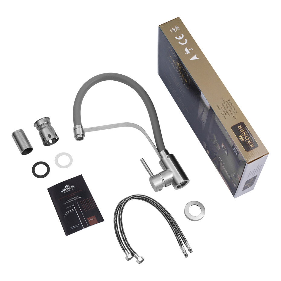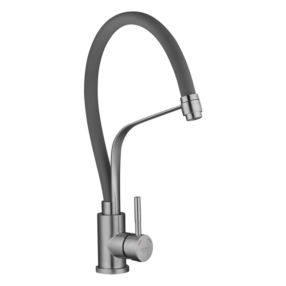 Kroner KRP Edelstahl Klassisch - ESG03593GRA — стильний кухонний змішувач із сірим гнучким гусаком, створений для комфортного щоденного використання. Міцний корпус із нержавіючої сталі забезпечує надійну роботу протягом багатьох років, а гнучкий вилив дозволяє легко регулювати напрямок потоку води.