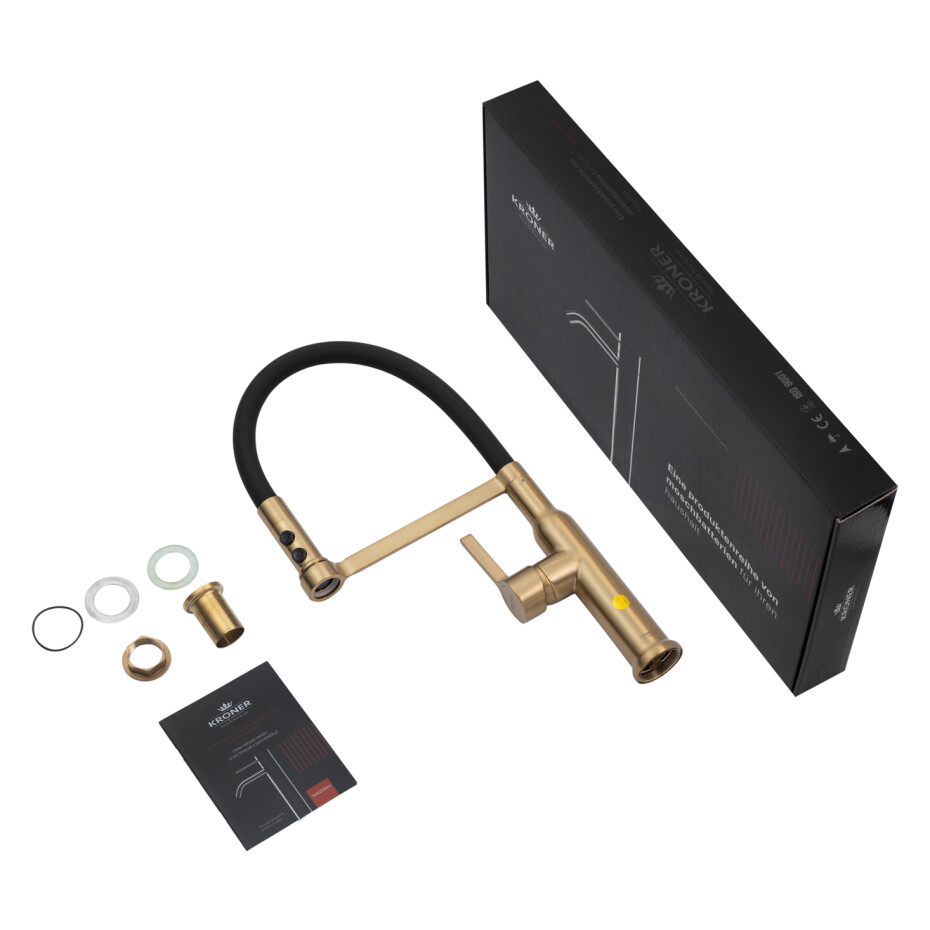 Kroner KRP Ersel - GBG03112BLK поєднує в собі міцний глянсовий золотистий корпус, гнучкий силіконовий вилив і універсальний аератор, що робить його практичним і стильним рішенням для сучасної кухні.