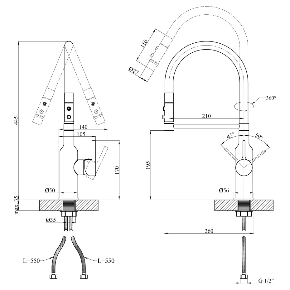 Монтується змішувач врізним способом, надаючи кухонній мийці стильний і сучасний вигляд. У комплект входять гнучкі шланги підключення діаметром 1/2'', що значно спрощує процес установки.