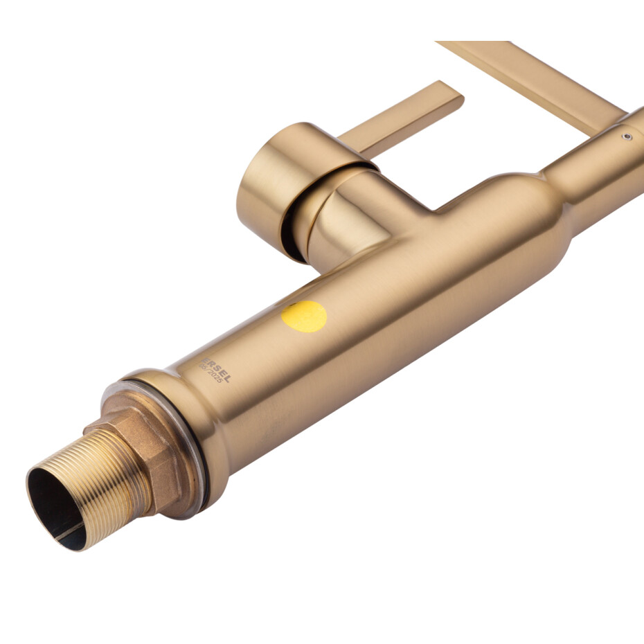 Корпус виготовлений з високоякісної латуні з глянцевим золотистим покриттям, яке надає змішувачу елегантний вигляд і захищає його від корозії. Гнучкий силіконовий вилив чорного кольору додає сучасний акцент і підвищує комфорт у щоденному використанні. Важливою особливістю є тримач, який фіксує вилив: він може працювати як у зафіксованому положенні, так і вільно маневрувати, що робить змішувач надзвичайно зручним в експлуатації.