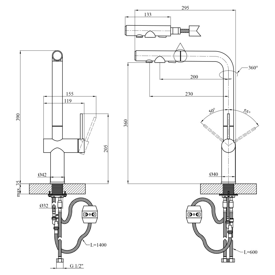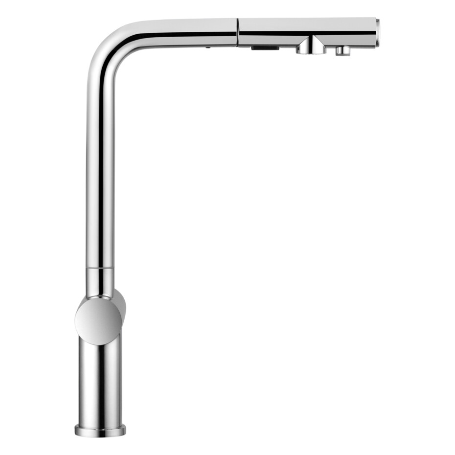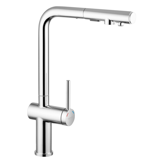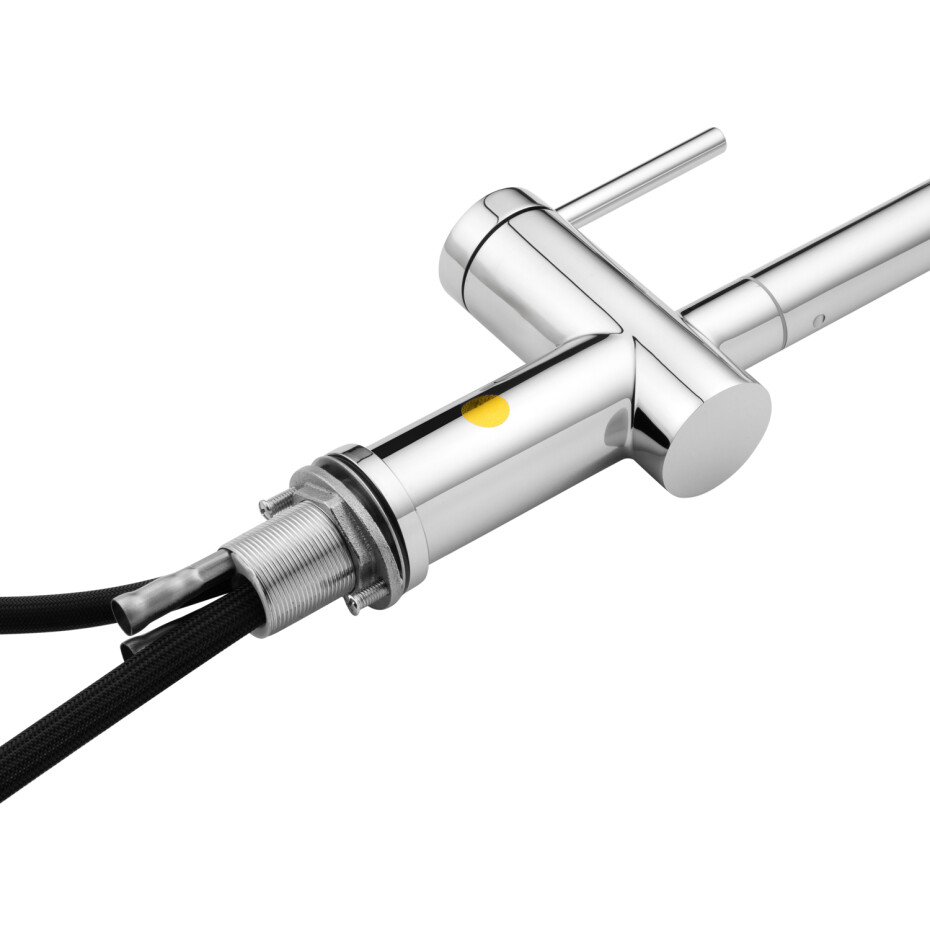 Модель оснащена висувним шлангом, який робить повсякденні завдання біля мийки значно зручнішими — миття посуду, наповнення великих місткостей і очищення раковини виконуються швидко і без зайвих зусиль. Практична кнопка перемикання режимів розташована прямо на висувній лійці, забезпечуючи інтуїтивне і комфортне управління потоком води одним натисканням.
