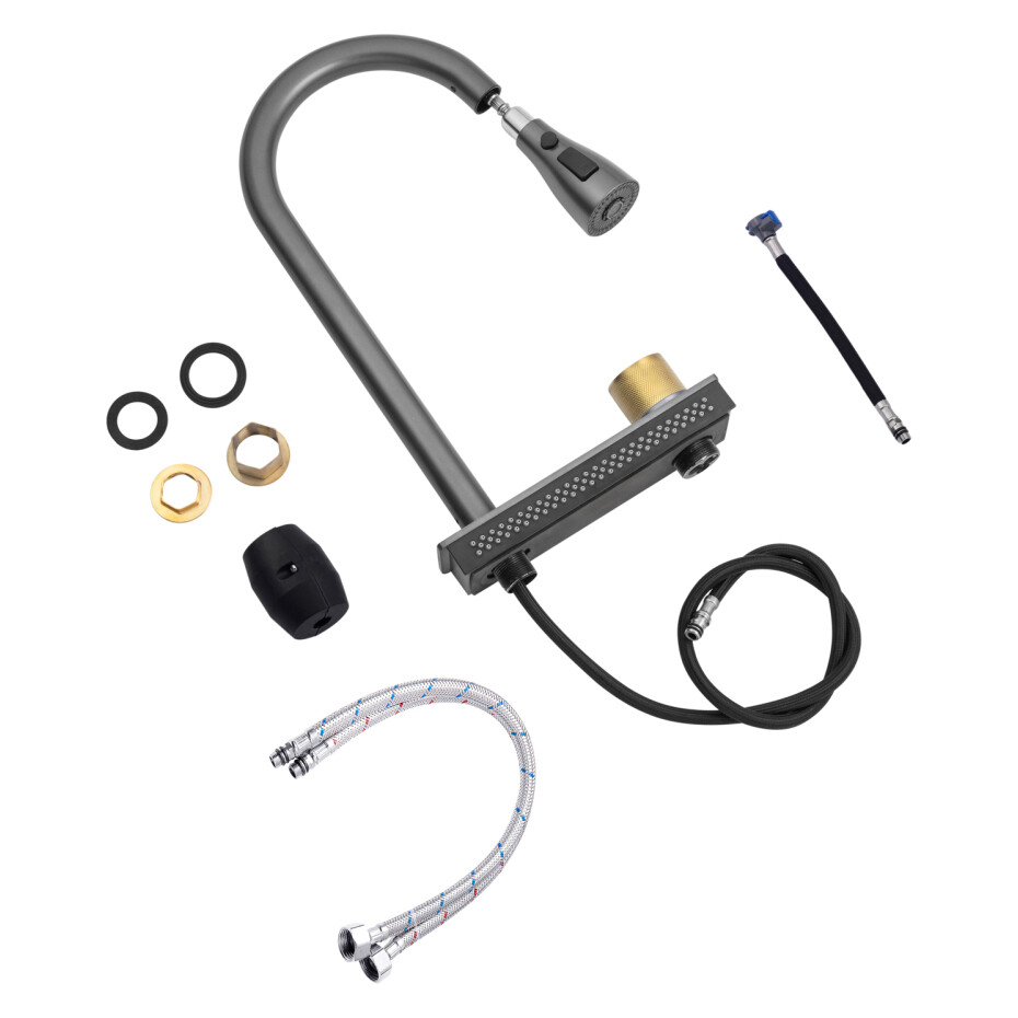 Змішувач виготовлений із нержавіючої сталі з обробкою brushed black, яка забезпечує преміальний вигляд, підвищену стійкість до подряпин і простоту догляду. Високий, поворотний та висувний гнучкий вилив робить роботу на кухні максимально зручною — від миття великих каструль до швидкого споліскування продуктів.