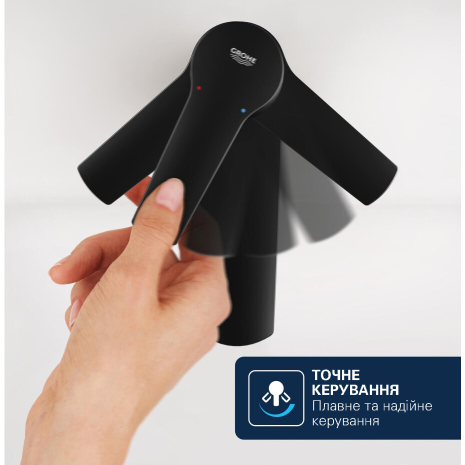 Чорне матове покриття додає змішувачу сучасного вигляду та ефектно підкреслює дизайн інтер'єру у стилі лофт, модерн або мінімалізм. Поверхня виконана за технологією GROHE Long-Life, що гарантує високу зносостійкість, стійкість до подряпин і плям.