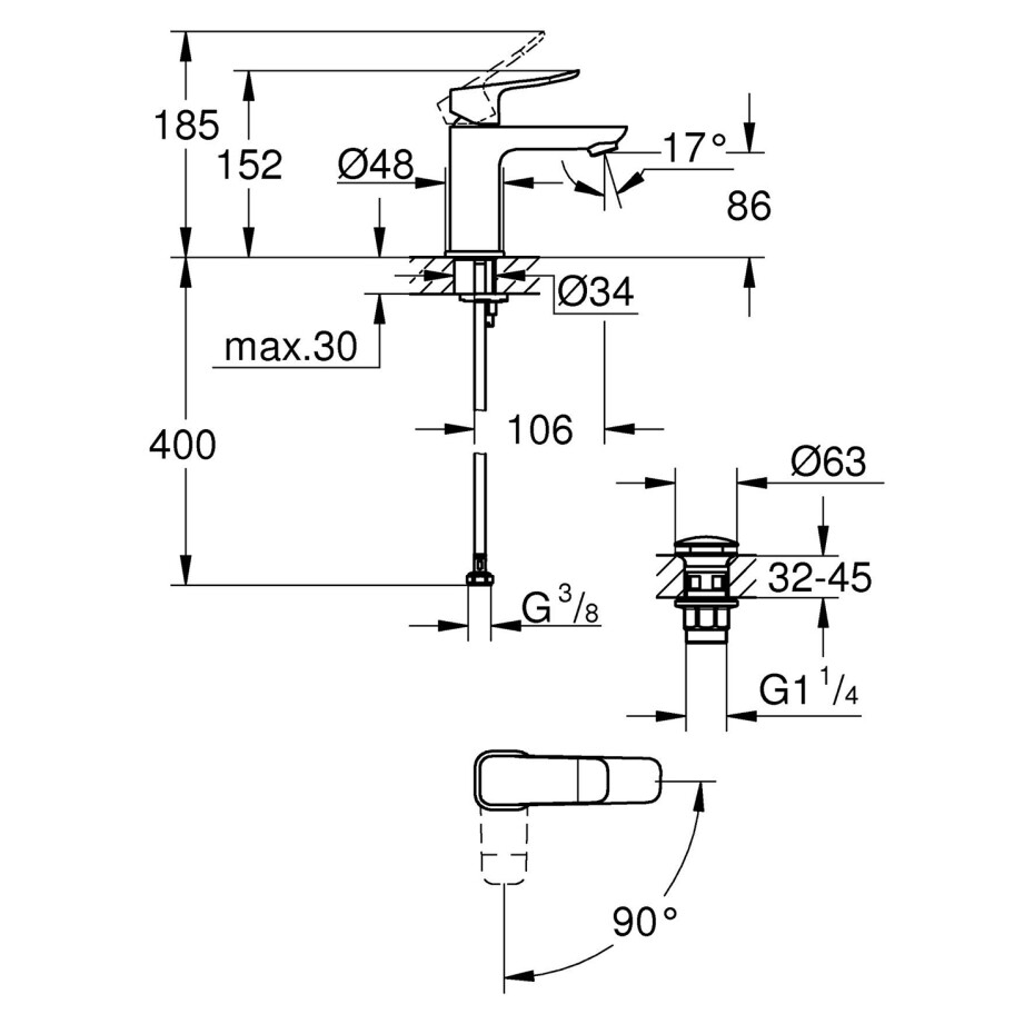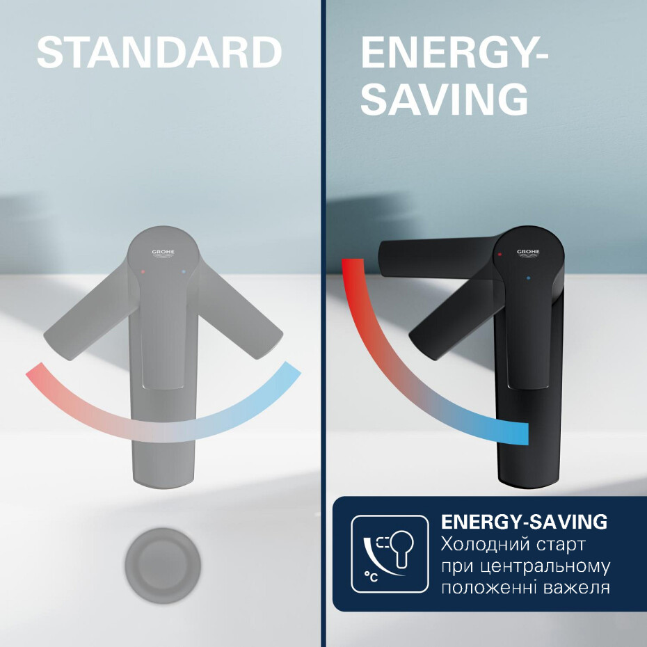 Технологія GROHE Water Saving знижує споживання води до 5 л/хв при тиску 3 бар, а система QuickFix і інструмент QuickTool 3-в-1 у комплекті забезпечують простий монтаж. Також у комплекті — натискний донний клапан 1 1/4" та гнучкі з’єднувальні шланги.