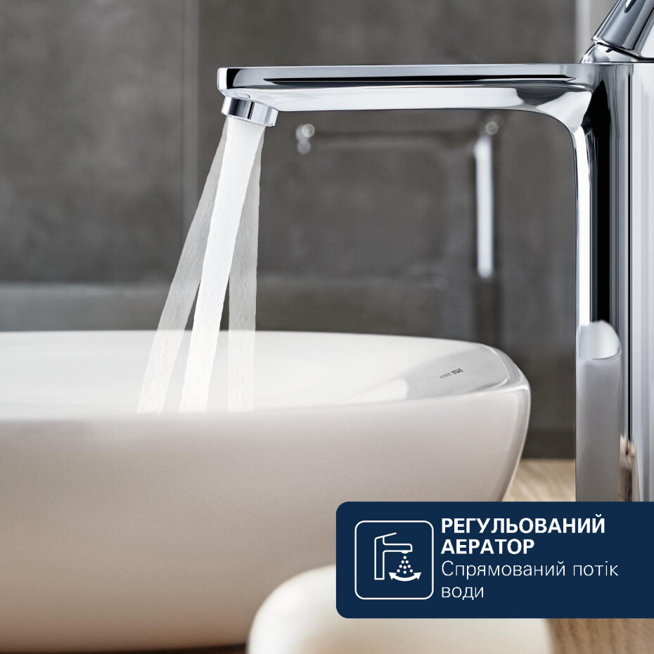 Інноваційний аератор GROHE AquaGuide дозволяє точно налаштувати напрямок потоку води відповідно до форми раковини. Управління змішувачем здійснюється легко й плавно завдяки надійному картриджу GROHE SilkMove та металевому важелю з елегантним вигином.