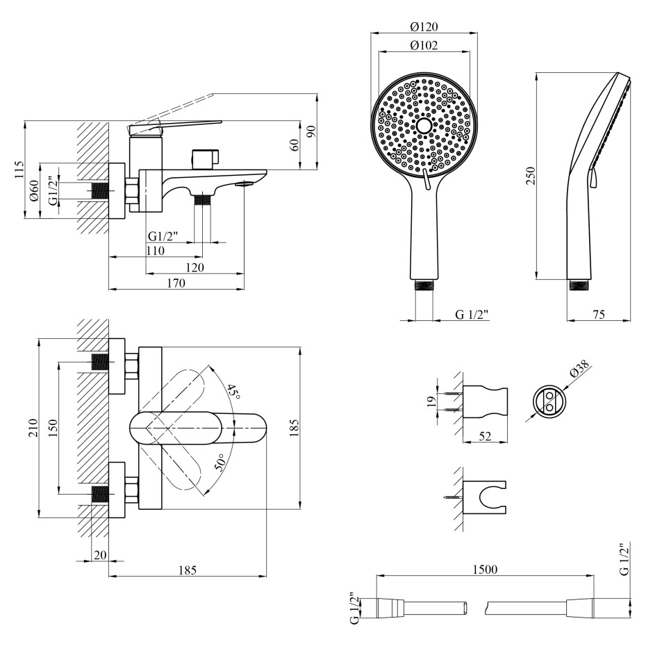 Комплектація: Змішувач, лійка для ручного душу, душовий шланг, кронштейн для ручного душу, кріплення, інструкція.