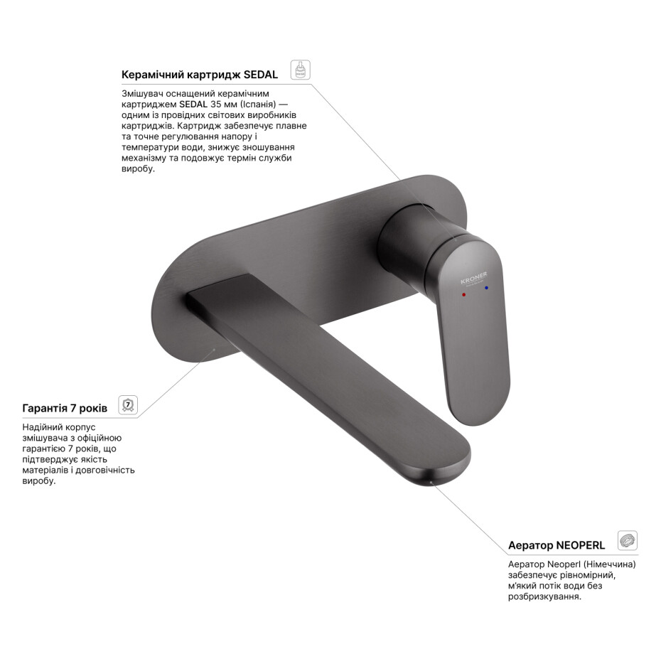 Модель оснащена керамічним картриджем SEDAL 35 мм (Іспанія) — одним із лідерів світового ринку. Він забезпечує плавне та точне регулювання температури й напору води, зменшує зношування механізму та гарантує довгий термін служби.