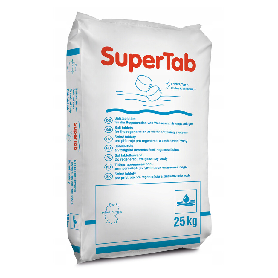 Сіль таблетована SuperTab - високоякісна сіль, що використовується для процесу регенерації іонообмінних смол. Сіль не кам'яніє і не злежується і як наслідок - не утворюється нерозчинних опадів. Випускається у формі таблетки, що має скошені краї, що дозволяє не тільки краще зберігатися в упаковці, але й дає додаткову економію при завантаженні в бак - солерозчинник. Така форма не дає таблетці кришитися і не залишає осаду на днище бака.