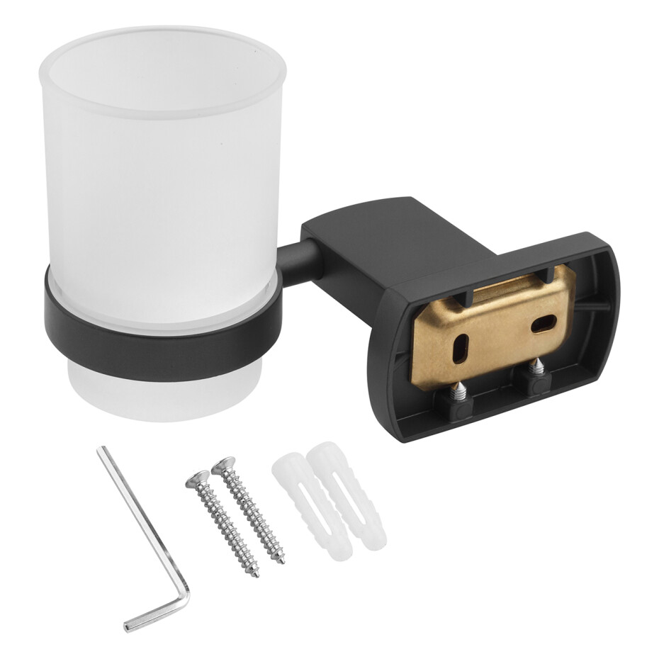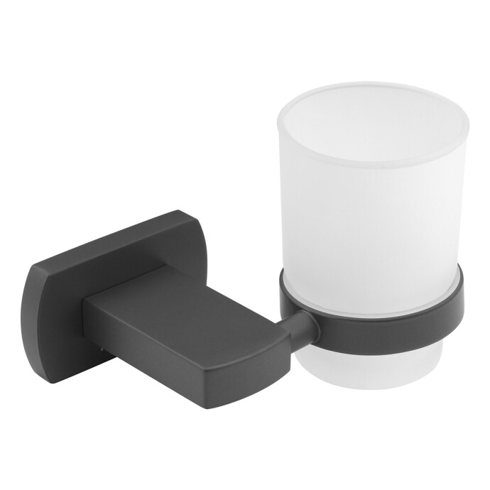 Склянка з тримачем для ванної кімнати Kroner KRP Graz - GRP95602 — стильний та практичний аксесуар для сучасної ванної кімнати. Склянка з матового скла надійно закріплена у тримачі з міцного цинку з матовим графітовим покриттям, яке додає виробу стриманої елегантності. Настінне кріплення дозволяє економити простір та зберігати чистоту на поверхнях. Завдяки продуманій формі та якісним матеріалам, аксесуар стійкий до корозії та легко очищується.