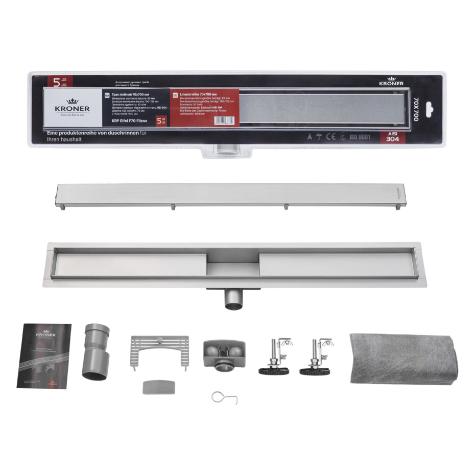 Завдяки прямокутній формі та розміру решітки 695х62 мм, трап ідеально підходить для сучасних душових кабін. Надійність виробу підтверджується гарантією 60 місяців, що робить Kroner KRP Eifel F70 Fliese практичним і довготривалим вибором для вашої ванної кімнати.