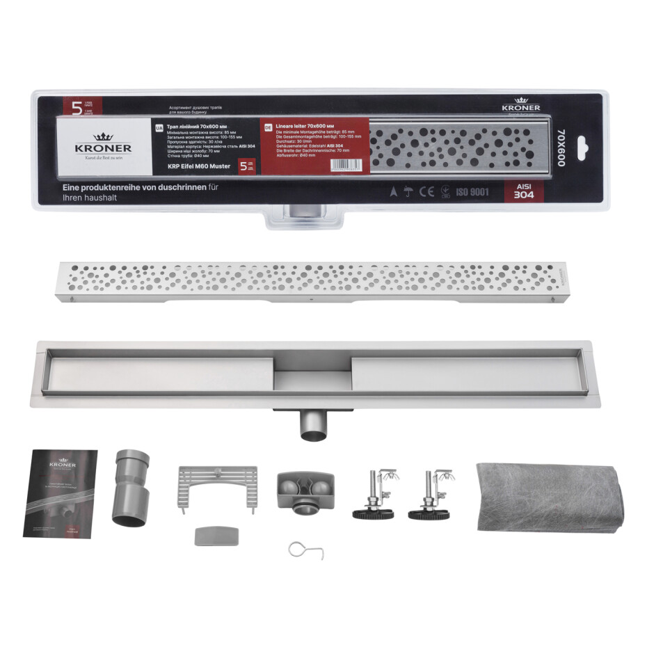 Завдяки прямокутній формі та розміру решітки 595х62 мм, трап ідеально підходить для сучасних душових кабін. Надійність виробу підтверджується гарантією 60 місяців, що робить Kroner KRP Eifel M60 Muster практичним і довготривалим вибором для вашої ванної кімнати..