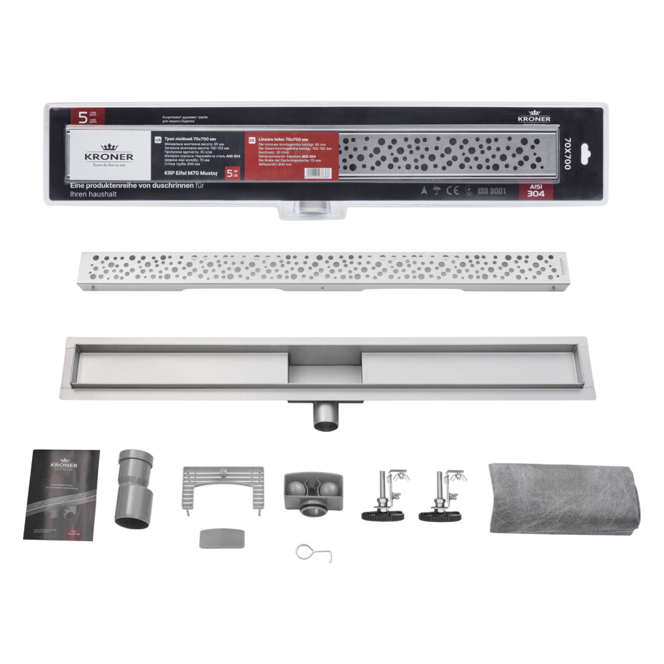 Завдяки прямокутній формі та розміру решітки 695х62 мм, трап ідеально підходить для сучасних душових кабін. Надійність виробу підтверджується гарантією 60 місяців, що робить Kroner KRP Eifel M70 Muster практичним і довготривалим вибором для вашої ванної кімнати.