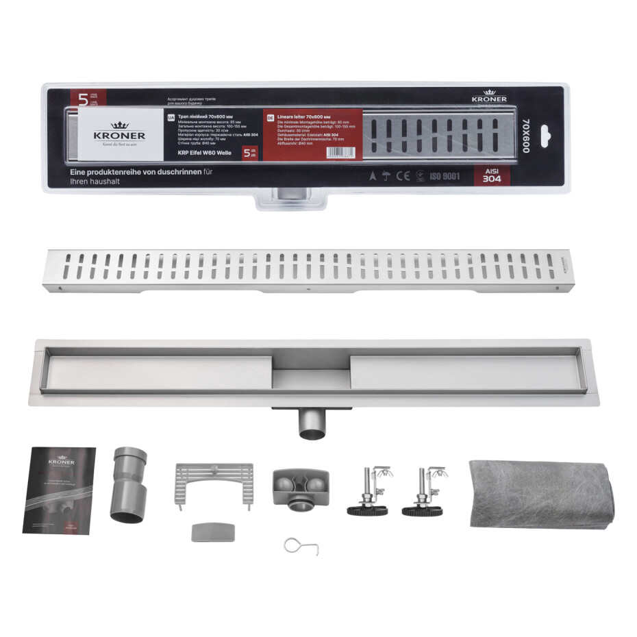 Завдяки прямокутній формі та розміру решітки 595×62 мм, трап ідеально підходить для сучасних душових кабін. Надійність виробу підтверджується гарантією 60 місяців, що робить Kroner KRP Eifel W60 Welle практичним і довготривалим вибором для вашої ванної кімнати..