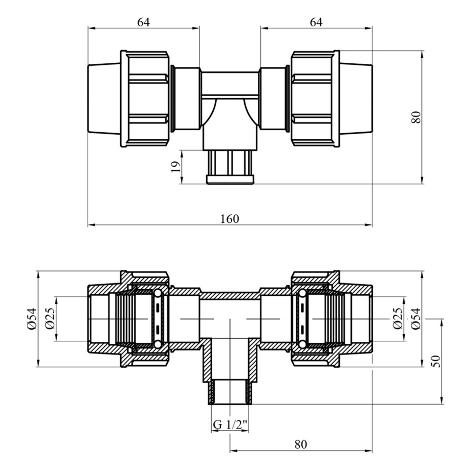 Діаметри: 25 мм (для труб) × 1/2" (внутрішнє різьблення) × 25 мм