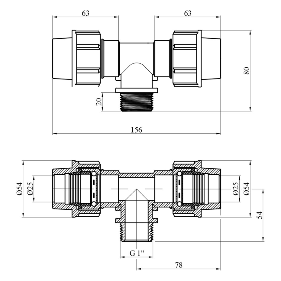 Діаметри: 25 мм × 1" (зовнішнє різьблення) × 25 мм