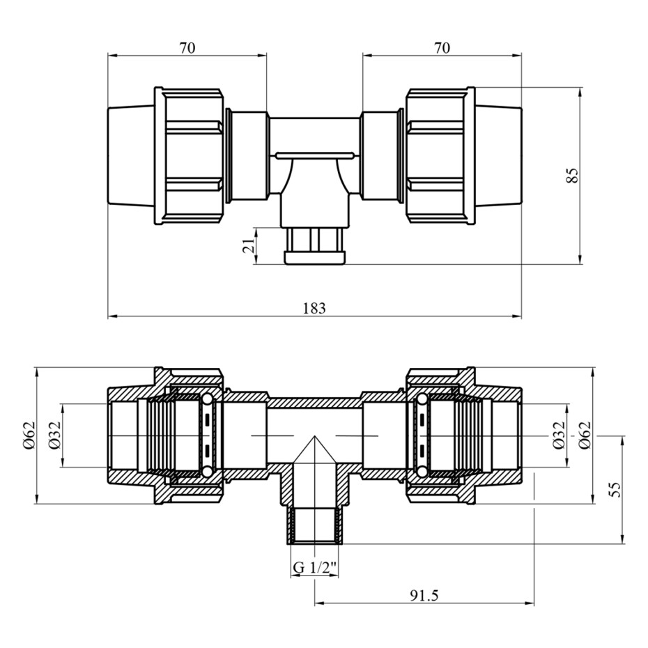 Діаметри: 32 мм (для труб) × 1/2" (внутрішнє різьблення) × 32 мм