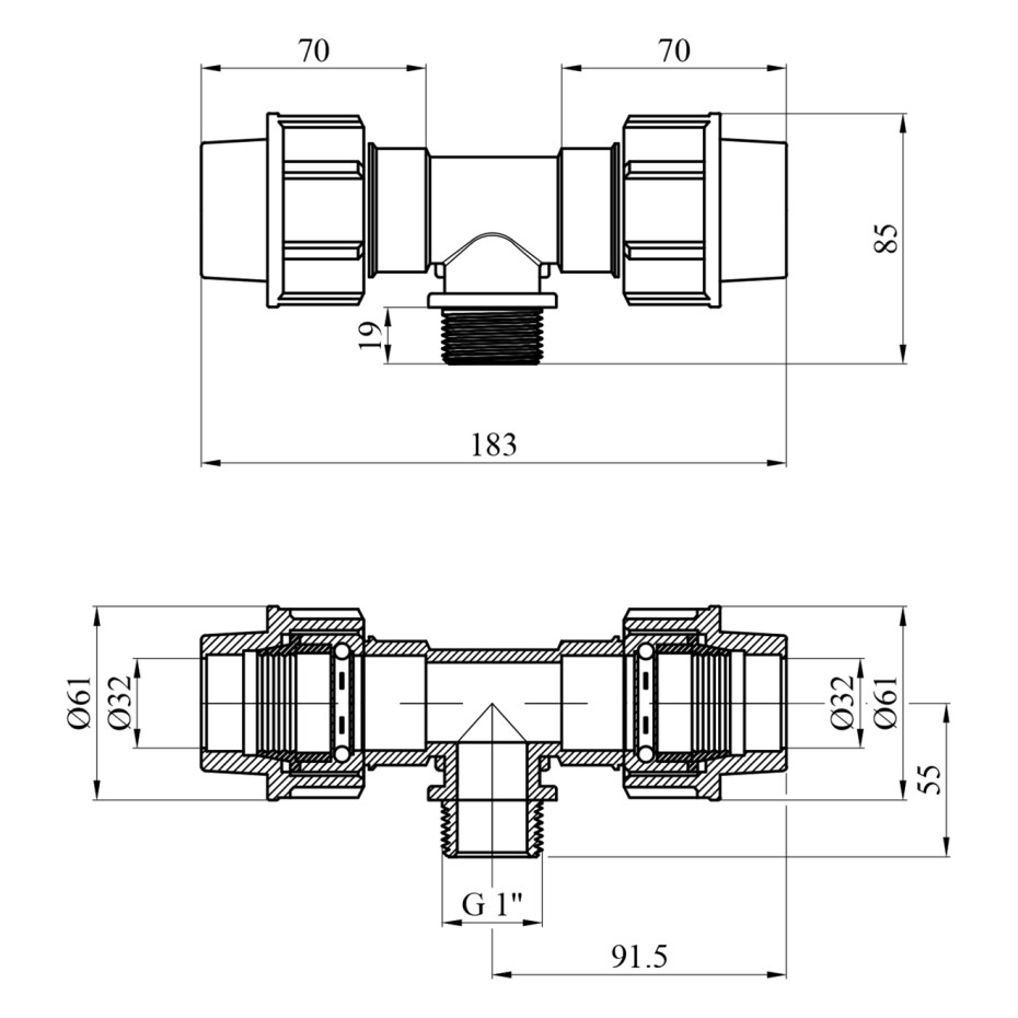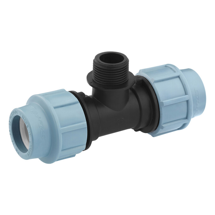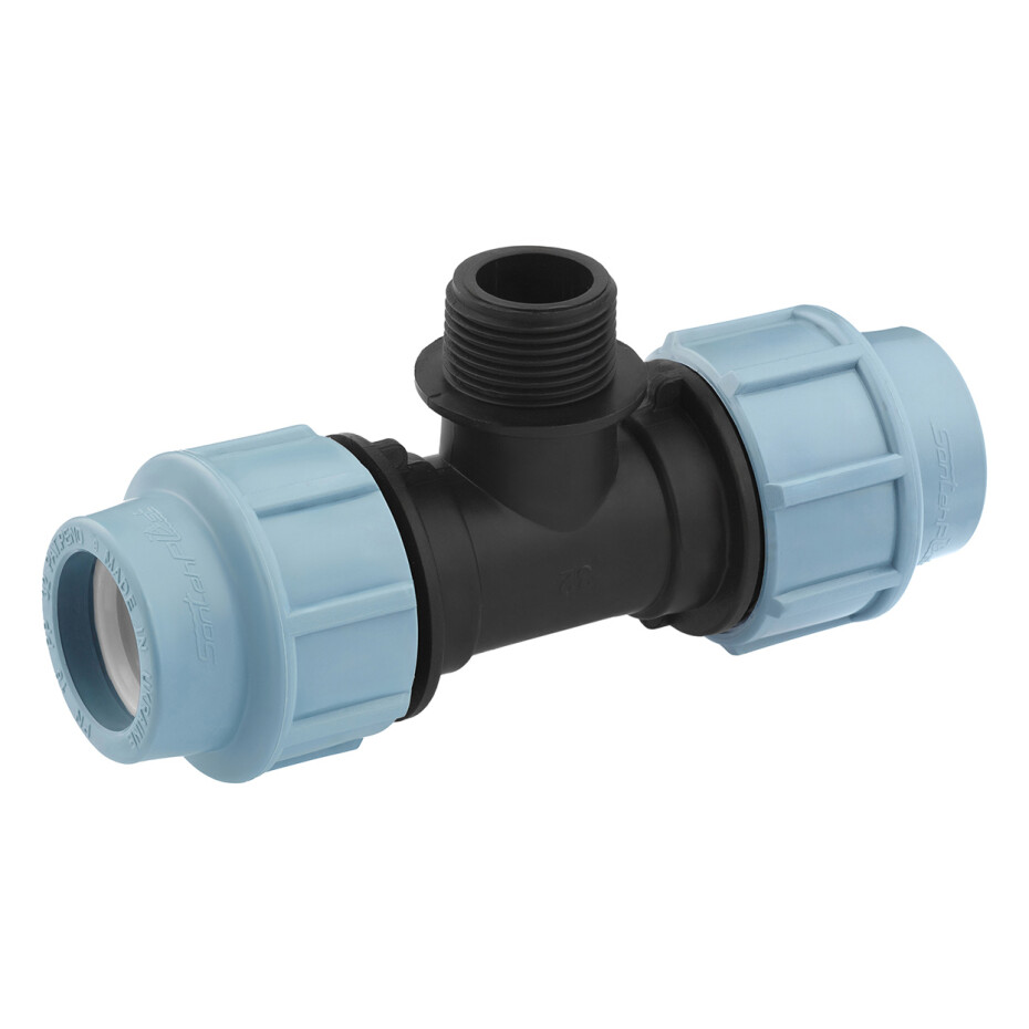 Трійник ПЕ SantehPlast 32х1"х32 РЗ - це компресійний фітинг з різьбовим виходом, призначений для з'єднання поліетиленових труб діаметром 32 мм з можливістю підключення до зовнішнього різьблення 1" (РЗ - зовнішнє різьблення).