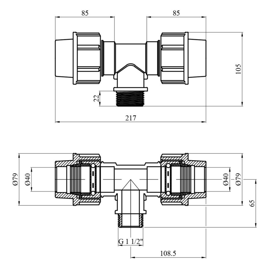 Трійник ПЕ SantehPlast 40х1 1/2"х40 РЗ - це компресійний фітинг з різьбовим виходом, призначений для з'єднання поліетиленових труб діаметром 40 мм з можливістю підключення до зовнішнього різьблення 1 1/2" (РЗ - зовнішнє різьблення).