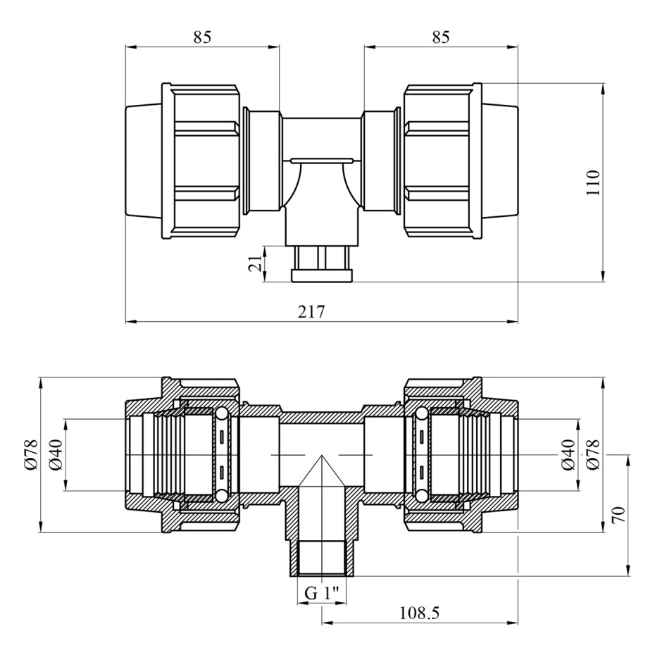 Діаметри: 40 мм (для труб) × 1" (внутрішнє різьблення) × 40 мм