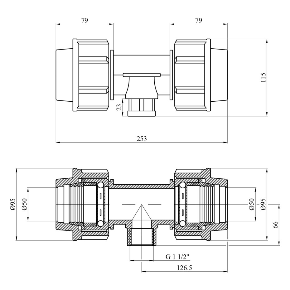 Діаметри: 50 мм (для труб) × 1 1/2" (внутрішнє різьблення) × 50 мм