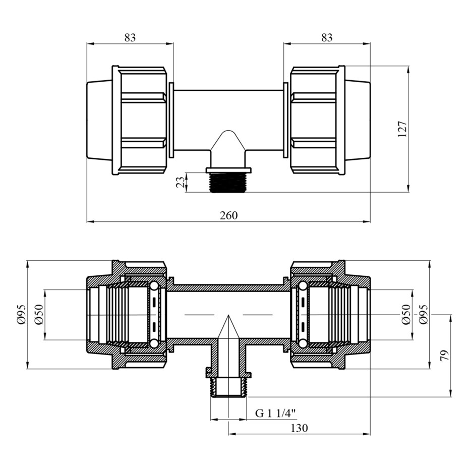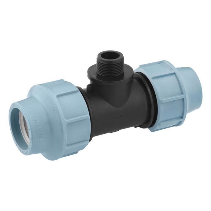 Трійник ПЕ SantehPlast 50х1 1/4"х50 РЗ - це компресійний фітинг з різьбовим виходом, призначений для з'єднання поліетиленових труб діаметром 50 мм з можливістю підключення до зовнішнього різьблення 1 1/4" (РЗ - зовнішнє різьблення).