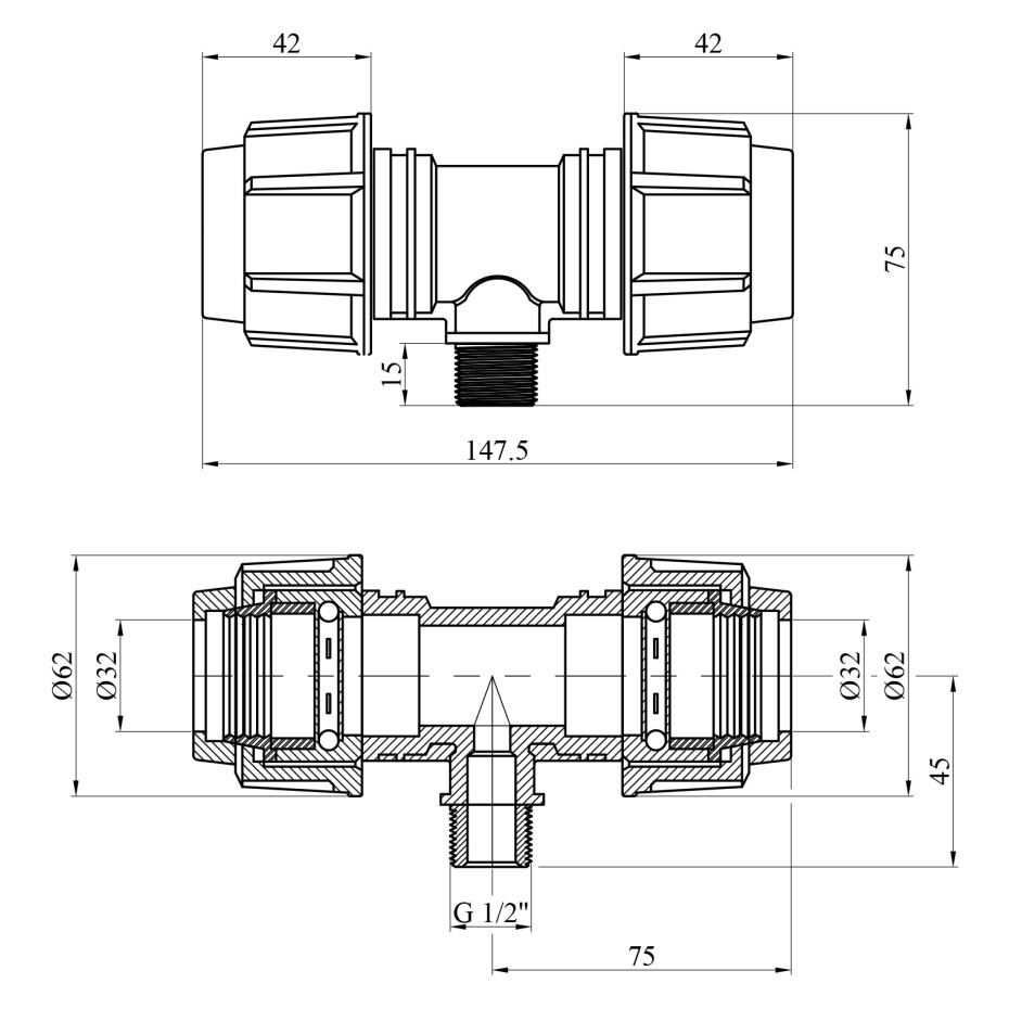 Трійник ПЕ SPT 32х1/2"х32 РЗ — це компресійний (обтискний) фітинг, що використовується для створення відгалужень у поліетиленових (ПЕ) трубопроводах, даючи змогу під'єднати обладнання або відгалуження з внутрішнім різьбленням.
