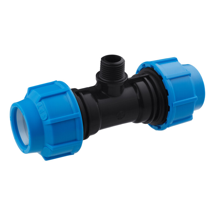 Тип з'єднання: компресійний (обтискний) для поліетиленових труб і різьбовий для відведення. Монтаж не потребує зварювального обладнання.