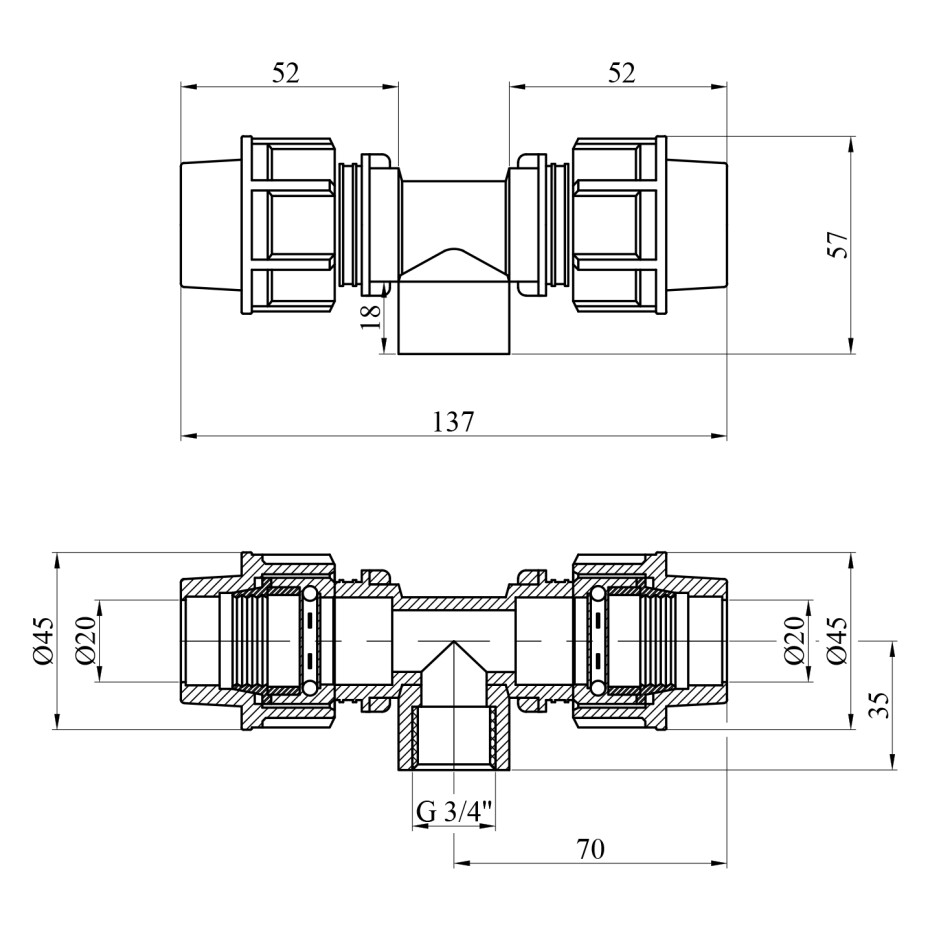 Трійник ПЕ STR 20х3/4"х20 РВ є практичним рішенням для швидкого і надійного створення відгалужень з різьбовим підключенням у поліетиленових системах.