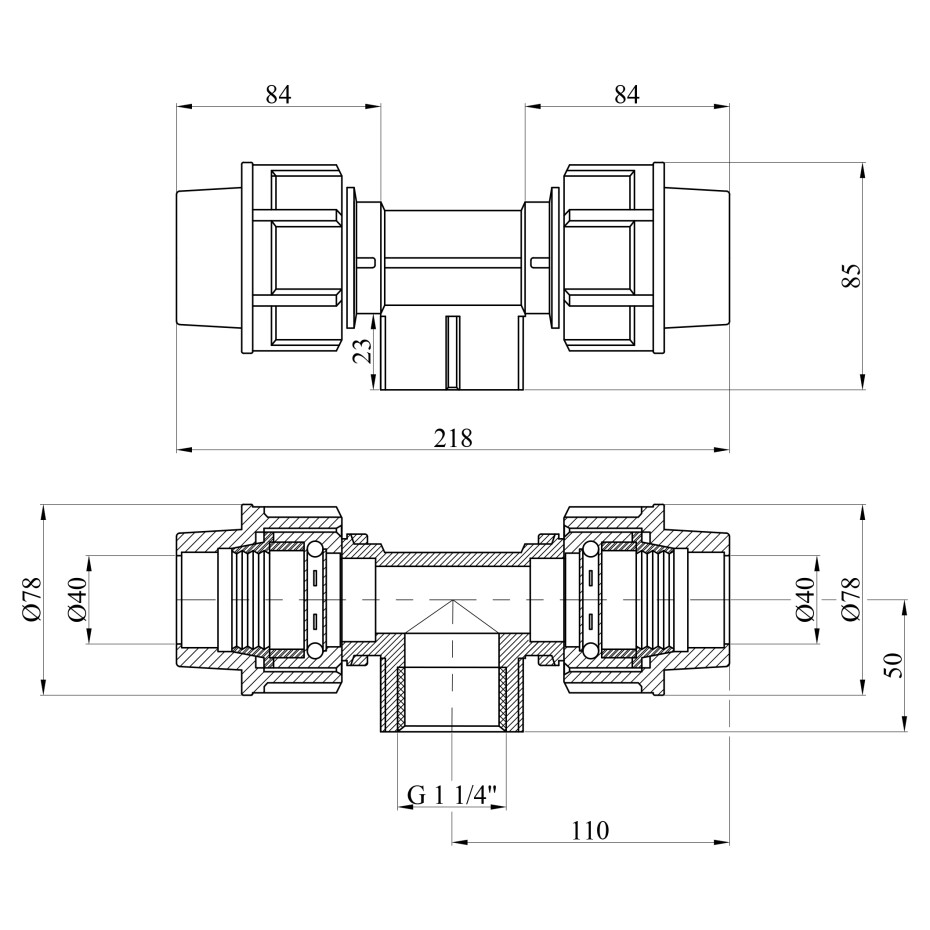 Тип з'єднання: компресійний (обтискний) для поліетиленових труб і різьбовий для відведення. Монтаж не потребує зварювального обладнання.