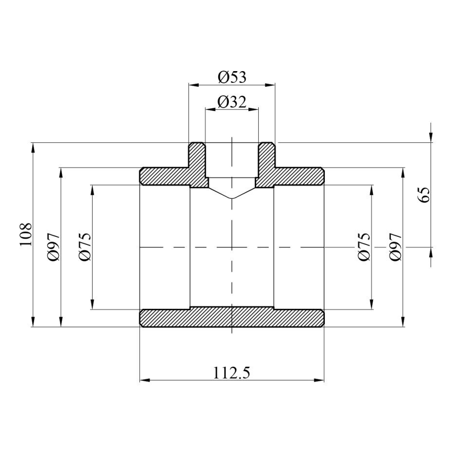 Розміри з'єднання: 75 мм - 32 мм - 75 мм (позначають розміри труб або переходів).