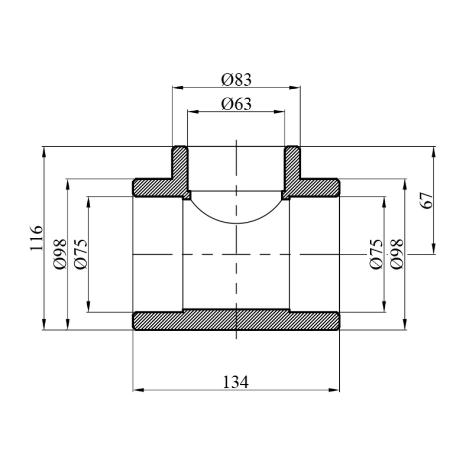 Розміри з'єднання: 75 мм - 63 мм - 75 мм (позначають розміри труб або переходів).