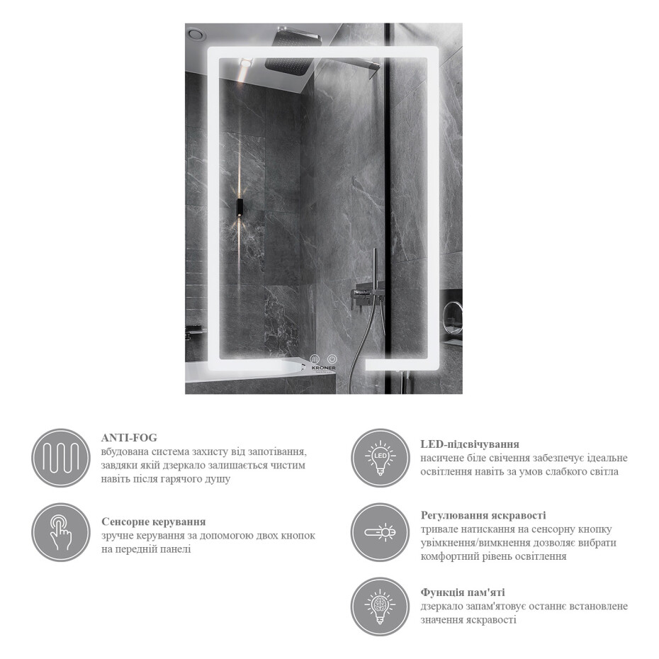 Дзеркало для ванної кімнати Kroner KRP Spiegel VR2-5080 з LED-підсвічуванням та антизапітнінням